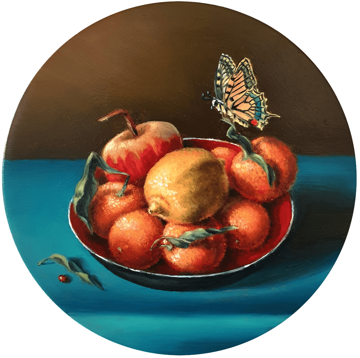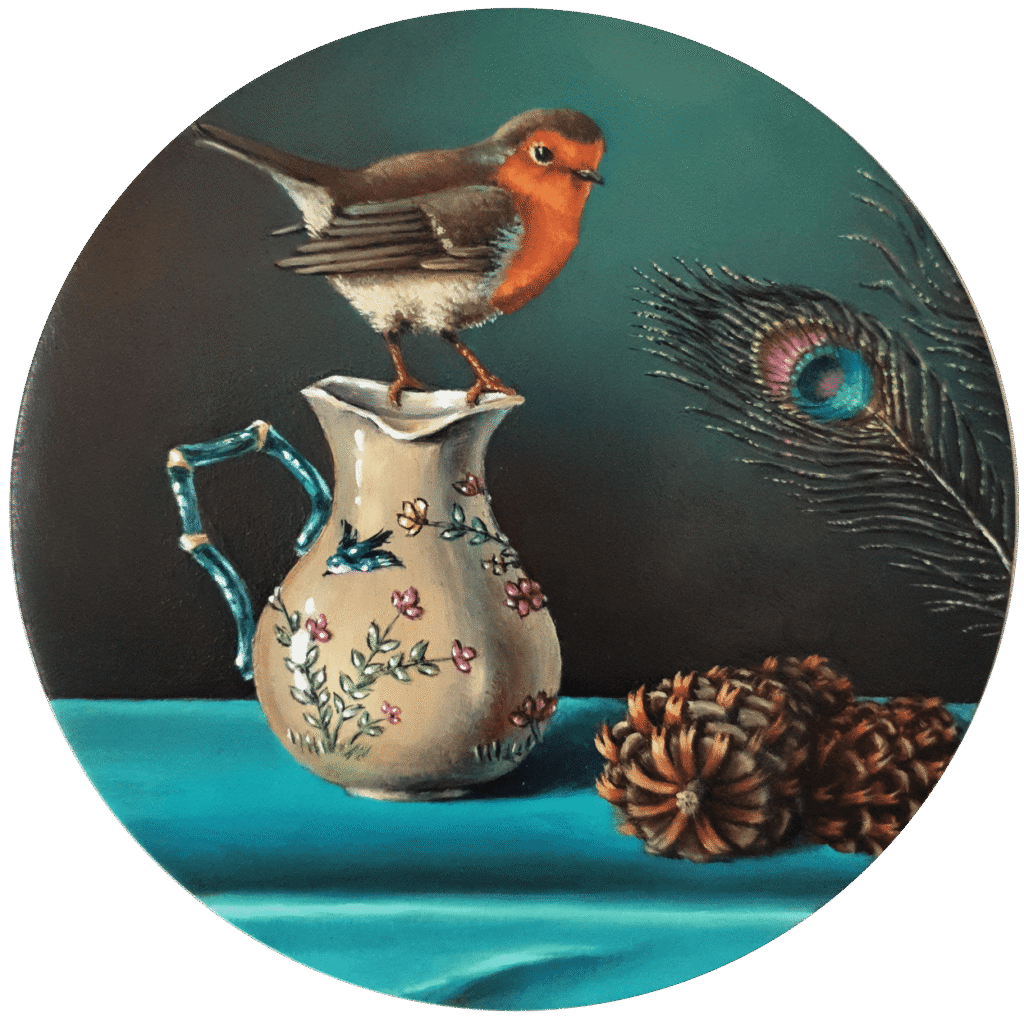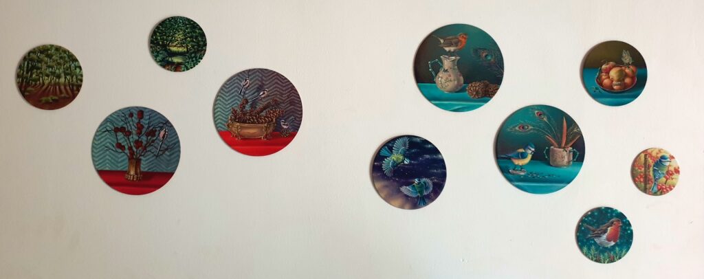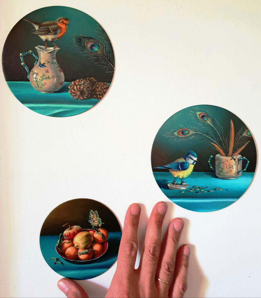 Ces petits cercles de cuivre sont des supports très agréables à travailler. La peinture à l’huile traditionnelle étant une superposition de fines couches transparentes, la lumière peut parvenir jusqu’à ce support réfléchissant et être renvoyée, procurant ainsi une belle vivacité et luminosité aux couleurs.
